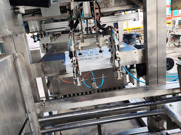 2.通過吸盤將包裝袋吸起,同時夾袋裝置將吸起的包裝袋移送到供袋整袋裝置,整袋裝置將包裝袋整袋調(diào)正。